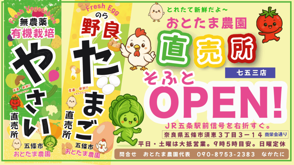 地元五條市で、無農薬有機栽培で生産している 「おとたま農園」の産直コーナーが店頭にございます。